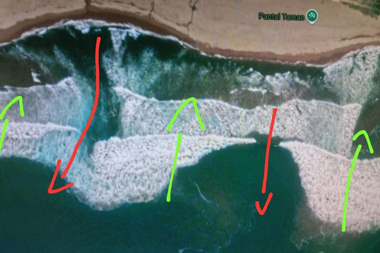 Gambar 3. Arus Rip Current pada Pantai Parangtritis dengan indikator panah merah adalah Rip Current dan panah hijau adalah gelombang yang didorng oleh angin ke arah bibir pantai (Sumber: https://www.kompas.com/tren/read/2024/09/03/164500265/ramai-soal-kemunculan-rip-current-di-pantai-parangtritis-dan-disebut?page=all, Diakses 21 April 2026).